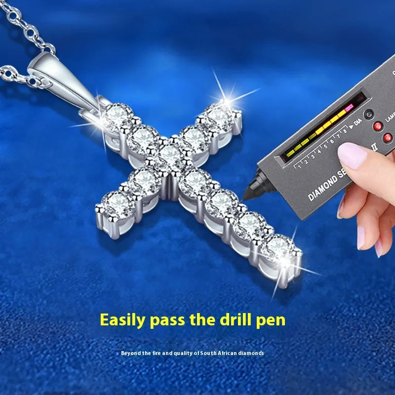This Moissanite cross necklace is crafted from pure 925 sterling silver and plated five times for lasting brilliance. Each stone is 5A-grade—clean, transparent, and cut to reflect light like a diamond. Whether worn for style or symbolism, this piece carries presence, clarity, and quiet power.