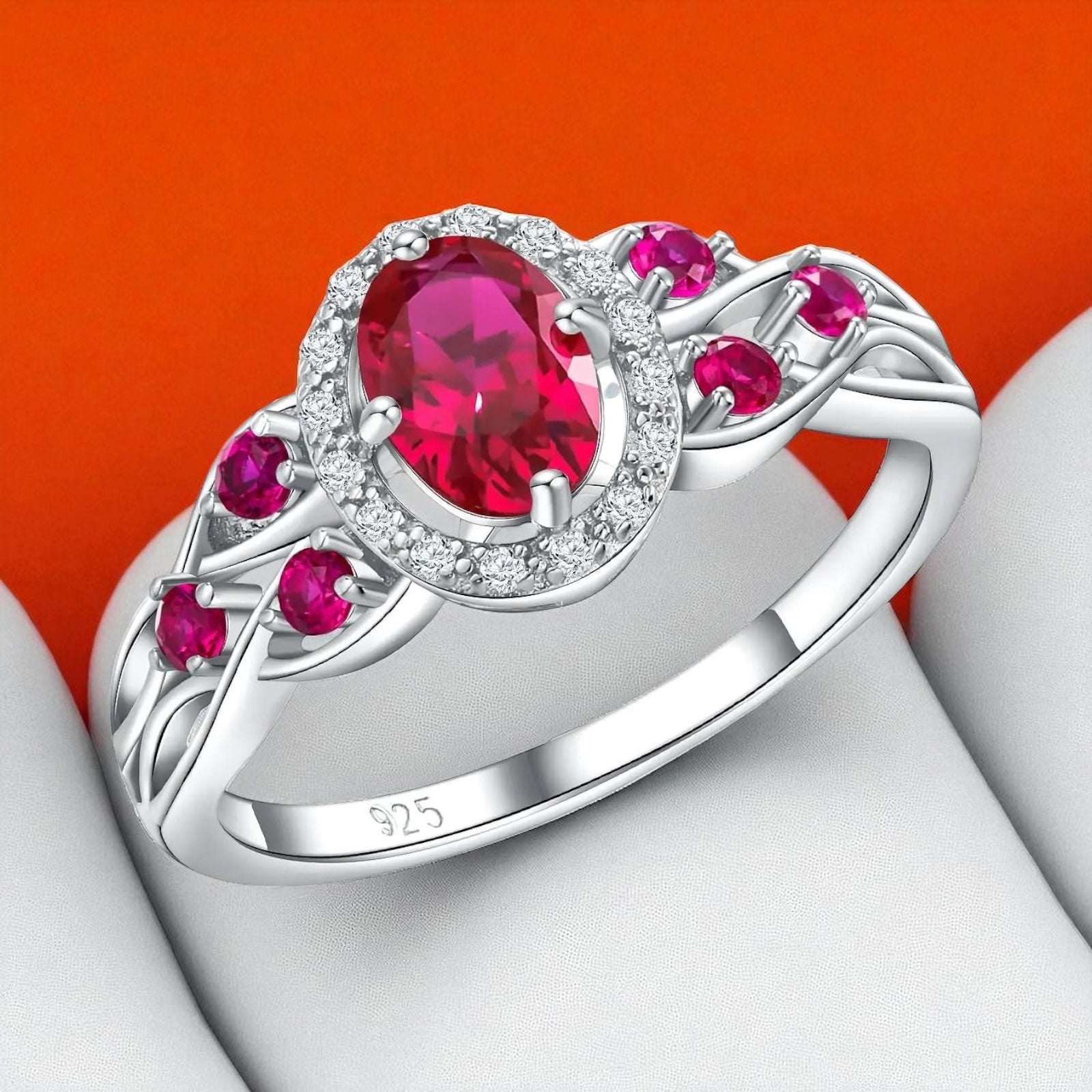 The ruby center catches light and attention—without apology.