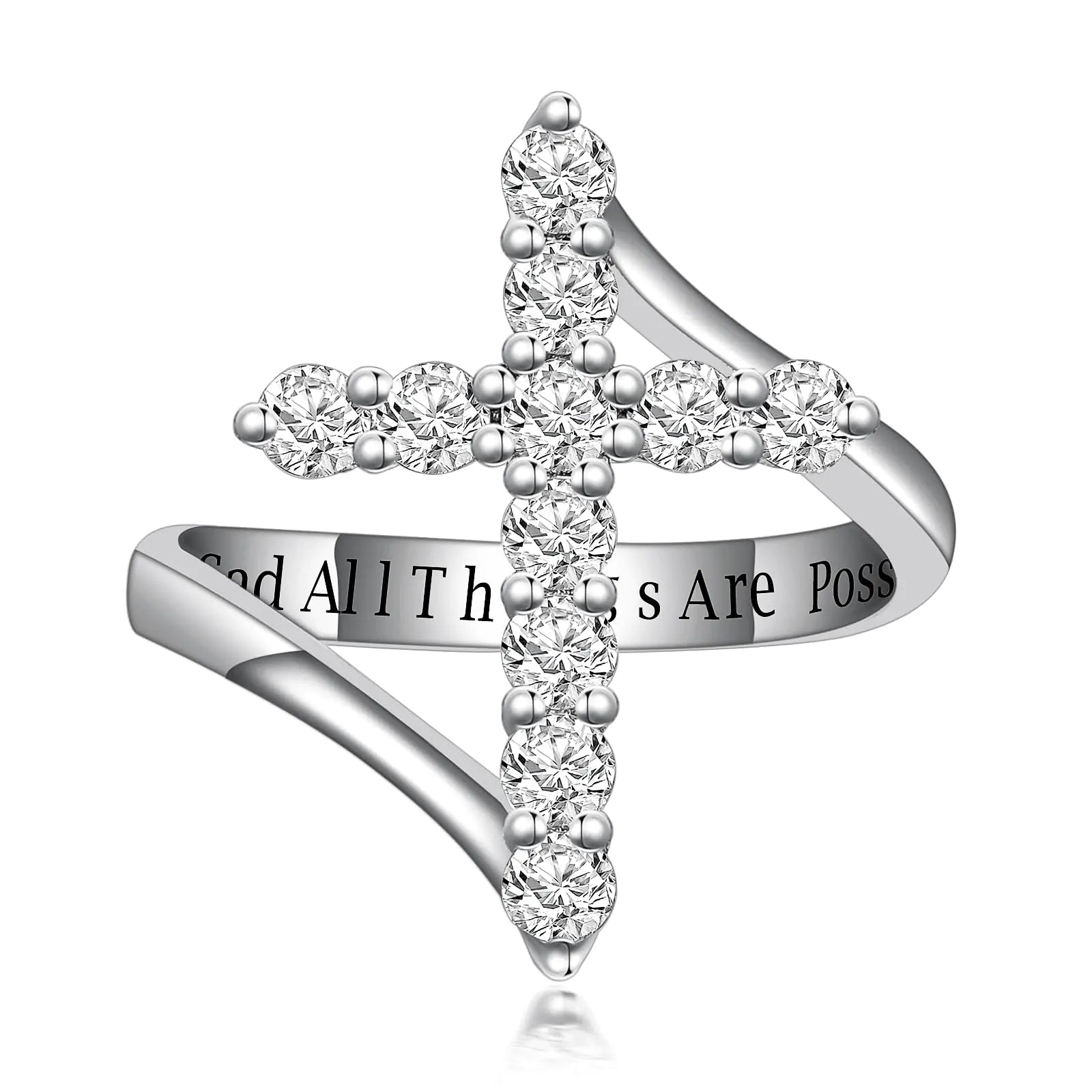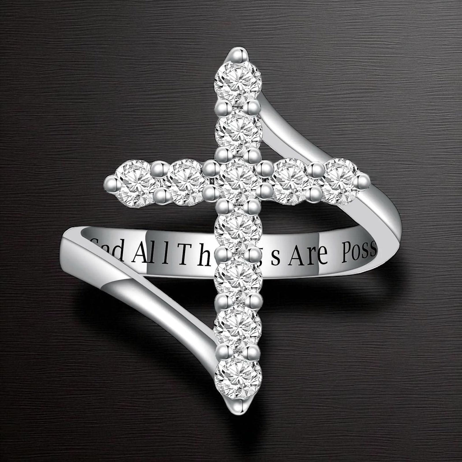 A ring that speaks to the soul. The Faith Ring is a radiant symbol of hope, devotion, and divine possibility. Featuring 11 hand-set moissanite stones in a platinum-toned cross formation, this piece blends luxurious craftsmanship with spiritual meaning. Inside the band, the engraved message “With God All Things Are Possible” offers daily affirmation and quiet strength. Whether gifted for baptism, graduation, or personal renewal, this ring becomes a wearable prayer—elegant, enduring, and deeply felt.